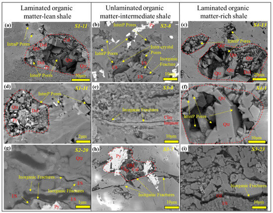 Interparticle (interP) pores, intraparticle (intraP) pores, and inter-crystal (inter-C) pores are all observed in the three types of shales. InterP pores show clear variation in sizes and are commonly distributed among quartz, plagioclase, clay, and calcite (Figure 4). The maximum interP pore, up to 80 μm, is observed in the laminated organic matter-lean shales, which is wider than that in the unlaminated organic matter-intermediate shales and laminated organic matter-rich shales (Figure 4a–c). All the primary interP pores are filled by quartz, dolomite, and pyrite and then partitioned into small pores (Figure 4a–d,f,h). IntraP pores, which commonly show small sizes and poor connectivity, are only observed within some dolomite and calcite, which may result from dissolution (Figure 4a). Inter-C pores are mainly observed between clay minerals (Figure 4b). Inorganic fractures generally distribute along the rims of quartz or clay laminae (Figure 4e,g–i).