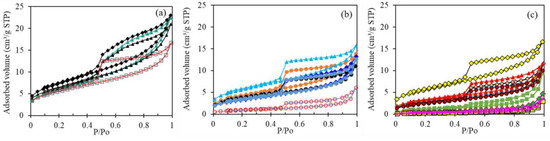 Low-temperature N2 adsorption is used to quantify pores with a diameter of 2 nm~100 nm. As the IUPAC recommended, hysteresis loops are divided into H1 (cylinder pores), H2 (ink-bottle-shaped pores), H3 (slit-shaped pores), and H4 (narrow slit-like pores) types based on their shapes [29]. H1 type shows the two branches approximately paralleling the gas adsorption axis (adsorbed volume), while H4 type shows the two branches almost paralleling the relative pressure axis (P/Po). H2 and H3 are intermediate cases between H1 and H4 [33,34].