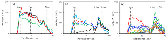 Pore diameter distributions obtained from low-temperature N2 adsorption. (a) Laminated organic matter-lean shale. (b) Unlaminated organic matter-intermediate shale. (c) Laminated organic matter-rich shale.