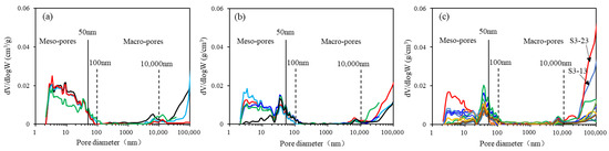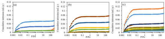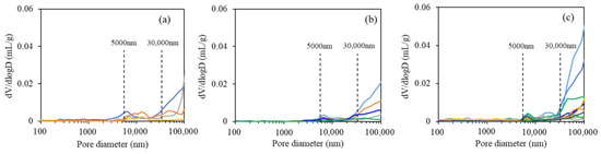 When coming to the unlaminated organic matter-intermediate shale and laminated organic matter-rich shale, cumulative intrusion volumes for three samples can exceed 0.05 mL/g when P/Po reach 0.02 (Figure 7b,c). Correspondingly, the quantity of macropores with a diameter of 30,000 nm~100,000 nm is higher (Figure 8b,c).