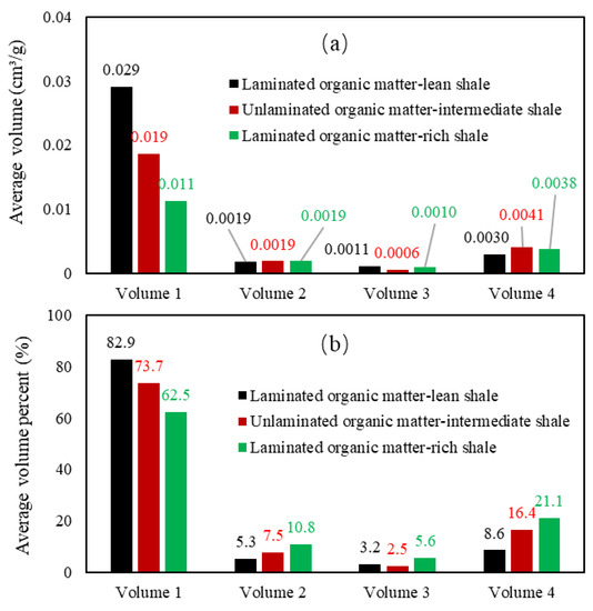 Each sample shows a higher Volume 1 than Volume 2, Volume 3, and Volume 4 (Table 2). Average Volume 1 for the laminated organic matter-lean shale is 0.029 cm3/g, which is higher than that for the unlaminated organic matter-intermediate shale (0.019 cm3/g) and laminated organic matter-rich shale (0.011 cm3/g) (Figure 10a). Whereas, average volumes 2, 3, and 4 for the laminated organic matter-lean shale are 0.0019 cm3/g, 0.0011 cm3/g, and 0.0030 cm3/g, which are close to those for the unlaminated organic matter-intermediate shale and laminated organic matter-rich shale (Figure 10a). This indicates that mesopore is the dominant pore type for all the shale, as the percents of Volume 1 are 82.9%, 73.7%, and 62.5% for the laminated organic matter-lean shale, unlaminated organic matter-intermediate shale, and organic matter-rich shale (Figure 10b). Percentages of Volume 4 are 8.6%, 16.4%, and 21.1% for the laminated organic matter-lean shale, unlaminated organic matter-intermediate shale, and laminated organic matter-rich shale (Figure 10b). Therefore, the pore space of the low-matured shale in the third member of the Jiufotang Formation is mainly contributed by mesopores, followed by macropores with diameters of 10,000 nm~100,000 nm.