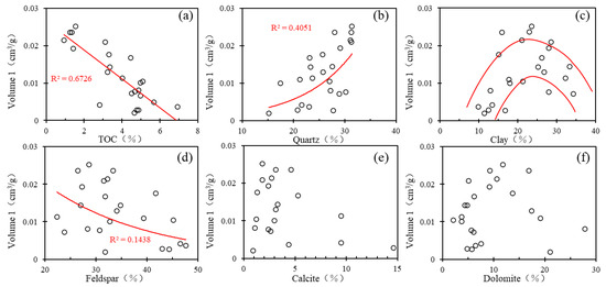Interrelationships between Volume 1 and shale compositions. Volume 1 is the total volume calculated from the pore diameter located at 2 nm~50 nm. (a) Volume 1 vs. TOC, (b) Volume 1 vs. quartz content, (c) Volume 1 vs. clay mineral content, (d) Volume 1 vs. feldspar content, (e) Volume 1 vs. calcite content, (f) Volume 1 vs. dolomite content.