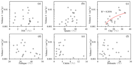 Interrelationships between Volume 4 and shale compositions. Volume 4 is the total volume calculated from the pore diameter located at 10,000 nm~100,000 nm. (a) Volume 4 vs. TOC, (b) Volume 4 vs. quartz content, (c) Volume 4 vs. clay mineral content, (d) Volume 4 vs. feldspar content, (e) Volume 4 vs. calcite content, (f) Volume 4 vs. dolomite content. Volume 4 shows a weakly positive association with clay minerals, with R2 = 0.2036 (Figure 12c). Ro of the third member of the Jiufotang Formation ranges from 0.66% to 0.68% and indicates the mesogenetic A stage during which quantities of smectite are transforming to illite [44]. Microfractures or pores can be generated during smectite-illite transformation due to crystal shrinkage [18], and they are commonly observed in shales at the first member of the Qingshankou Formation [19,20]. Moreover, curvy inorganic microfractures can be observed within clay lumps (Figure 4b), clay laminae (Figure 4e,g), or between clay laminae and other minerals (Figure 4i). Consequently, we consider the limited increase in Volume 4 to result from the transformation of smectite to illite [45,46,47].