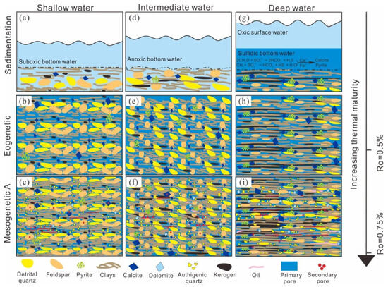 The unlaminated organic matter-intermediate shale was deposited in the intermediate water. Homogeneous texture and coarse particles were probably related to underflow, which was very common in this area during the Jiufotang stage [49]. Dissolved oxygen in the bottom water decreased to an anoxic state as the water depth increased, leading to a moderate content of organic matter and some scattered pyrite (Figure 13d). At the eogenetic stage, primary macropores largely decreased, and minerals turned to point-contact relationships due to compression (Figure 13e). As we entered the mesogenetic A stage, organic matter and clay minerals were squeezed into the primary macropores, in which diagenetic quartz, pyrite, and dolomite precipitated. Occasionally, secondary pores and fractures developed due to the dissolution of carbonate minerals and the transformation of smectite to illite (Figure 13f). The increased content of flexible organic matter had resulted in a decrease in mesopores in the unlaminated organic matter-intermediate shale.
