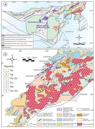 The Liaodong Peninsula is located in the southern part of Liaoning Province in Northeast China and hosts numerous medium- and large-scale lead-zinc, gold, and silver deposits. These deposits can be divided into Paleoproterozoic strata-bound Pb-Zn mineralization (e.g., Zhenzigou, Dongsheng, and Beiwagou Pb-Zn deposits [1,2]) and Mesozoic magmatism-related vein-type Pb-Zn-Au-Ag mineralization (e.g., Baiyun and Wulong Au and Gaojiapuzi Ag deposits [3,4,5]). Previous studies have shown that later magmatism-related Pb-Zn veins were spatially superimposed onto the former stratiform Pb-Zn orebodies (e.g., the Zhenzigou Pb-Zn deposit [2,6]), which is also documented in many ore districts worldwide, e.g., the Yenefrito Pb-Zn mine in the Pyrenees, Spain [7], the Macmillan Pass Pb-Zn ± Ba deposit in Yukou, Canada [8], and the Red Dog Zn-Pb-Ag district, Northern Alaska [9]. Due to essential base metal elements, studies on the mineralization process of lead-zinc deposits have been pursued by scholars around the globe, and the type of genesis can be classified into SEDEX [2], skarn [10,11], Mississippi Valley-type (MVT) [12], and hydrothermal vein-type deposits [13]. In this context, the ore genesis and metal sources of the Pb-Zn deposits in the Liaodong Peninsula are still debated, as indicated by the Proterozoic seafloor exhalation model [2,14] and the sedimentation metamorphism-hydrothermal reworking model [15,16]. In addition, hypotheses about these strata-bound sedimentary-dominated Pb-Zn deposits formed by either true exhalative processes or subseafloor replacement during sedimentation or early diagenesis are contentious [17,18,19].