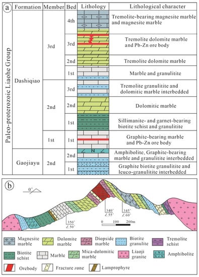 (a) Stratigraphic column of the Beiwagou Pb-Zn deposit; (b) The No. 8 exploration section map in the Beiwagou Pb-Zn deposit (modified from [35]).