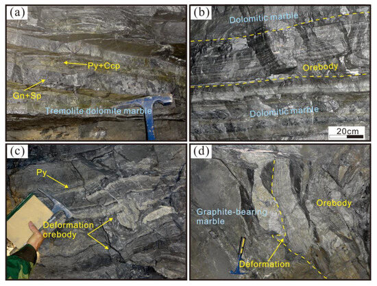 Photographs of strata-bound mineralization in tremolite dolomite marble (a) and dolomitic marble (b) of the Dashiqiao Formation; (c,d) Deformation orebodies in the Beiwagou deposit.