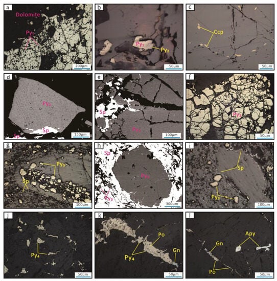 Photomicrographs of the Beiwagou Pb-Zn ore textures: (a) Subhedral, porous-to-massive pyrite (Py1); (b) Subhedral, porous-to-massive pyrite (Py1) and subhedral, porous crushed pyrite (Py2) developed in dolomitic marble; (c) Fine-grain chalcopyrite in the Py1; (d,e) Py2 replaced with sphalerite (BSE image); (f) Subhedral, porous crushed pyrite (Py2); (g) Clusters of rounded and porous pyrite (Py3); (h) Py3 replaced with sphalerite (BSE image); (i) Py3 replaced with sphalerite; (j) Anhedral, porous-to-massive pyrite (Py4); (k) Py4 replaced with pyrrhotite and galena; (l) Py4 replaced with pyrrhotite, galena, and arsenopyrite. Abbreviations: Apy = Arsenopyrite; Ccp = Chalcopyrite; Gn = Galena; Po = Pyrrhotite; Py = Pyrite; Sp = Sphalerite.