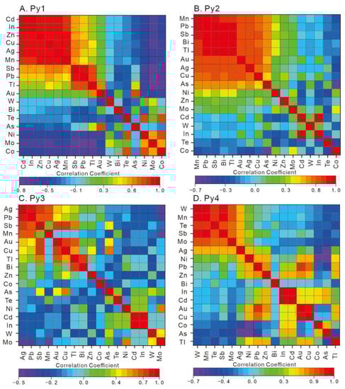 Correlation matrices showing element compositions of each pyrite type (including Py1, Py2, Py3, Py4).