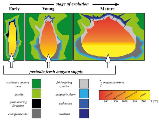 In general, skarn formation is a very common process at magma chambers emplaced in carbonate-bearing host-rocks independent of the magma composition. The overall results of the interaction in the peripheral parts of the magma chamber (i.e., in contact with the carbonate host-rock) include the formation of mushy solidification front rocks (e.g., syenites, fergusites) or cumulates (clinopyroxenites), endoskarns, exoskarns and thermometamorphically altered host carbonates [3,10,13]. The extent of these zones depends very much on interaction time (or maturity of the magma chamber) and magma chamber stability [3].