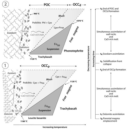 In this model, the parental magma is of a leucitite-basanite composition, interacting with a dolostone host-rock. In the first step, this interaction will lead to the formation of a primitive olivine clinopyroxene cumulate (OCCp) and an endoskarn-phase dominated by CaTs-rich clinopyroxene within the magma and an exoskarn-phase within the host-rock. The formation of this olivine and clinopyroxene-bearing solidification front induces magma differentiation, which is controlled through the dolomite wall-rock and CaO-rich melt assimilation, toward a trachybasaltic composition. When this solidification front collapses [88], the trachybasaltic melt interacts with the wall-rocks, initiating the second step, during which the differentiated olivine clinopyroxene cumulates (OCCs) and, closer to the host rock and hence at lower T, the phlogopite-bearing orthocumulates (POCs) form. The occurrence of a trachybasaltic melt, which is absent in other eruptive products at CAVD, has been confirmed by melt inclusions in the olivine of the OCCp [10].