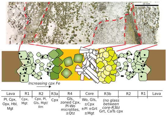 In this idealized scheme, reaction zone R1 mainly consists of clinopyroxene and magnetite, which originates from the magma. R2 mainly consists of plagioclase and clinopyroxene, with some interstitial glass and rare amounts of amphibole. R3 is a thin layer of clinopyroxene, separating R2 from R4, which consists of vesiculated glass, clinopyroxene and microlites of plagioclase and wollastonite. In some samples, larger quartz crystals are also present in R4. In some samples, the glassy R4-zone is missing, and the R3-zone consists of Ca-Tschermak-rich clinopyroxene and garnet [13]. The exoskarns have been subdivided into two groups based on their respective mineralogy: Group A) wollastonite, garnet and plagioclase as the major mineral phases with minor amounts of Ca-Tschermak-rich clinopyroxene, quartz and calcite; and Group B) gehlenite, garnet (grossular), Ca-Tschermak-rich clinopyroxene, spinel, wollastonite and plagioclase [13]. The occurrence of wollastonite, garnets and Ca-rich clinopyroxene, and the absence of Mg-rich skarn minerals like olivine or periclase indicate that the assimilated wall-rock was Ca-rich limestone. In Figure 6, a schematic overview of the involved process of skarn formation at Merapi is given.