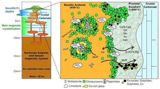 Profound knowledge on carbonate assimilation by magmas and skarn formation around magma chambers emplaced in limestone basements has been acquired through various approaches over the last ~30 years. Many studies focused on the petrographic and geochemical description of skarn and cumulate xenoliths and their respective mineralogy within eruptive products [1,2,3,4,6,7,8,9,10,11,13,14,22]. Studies on isotope mass balance calculations [5,23], on in-situ stable isotopes [12] and on induced changes in magmatic redox conditions and phase equilibria [24,25] shed additional light on the processes and results of skarn formation. Experimental carbonate assimilation studies have provided valuable insights into the kinetics of decarbonation and carbonate dissolution in magmas [18,26,27,28,29,30]. Lastly, the economic metallogenic potential of the involved metasomatizing magmatic fluids has also been researched [31,32].