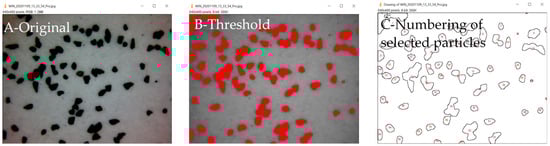 As shown in Figure 1, a similar methodology presented by Guven et al. [14] was followed for image analysis. In other words, after taking the image with a definite magnification with a microscope, the particles within the defined particle size range were labeled in red by using the threshold method, and then the shape factor of each particle was determined after these analyses. If the roundness of the particle was decreasing, the high precision roundness value approached zero.