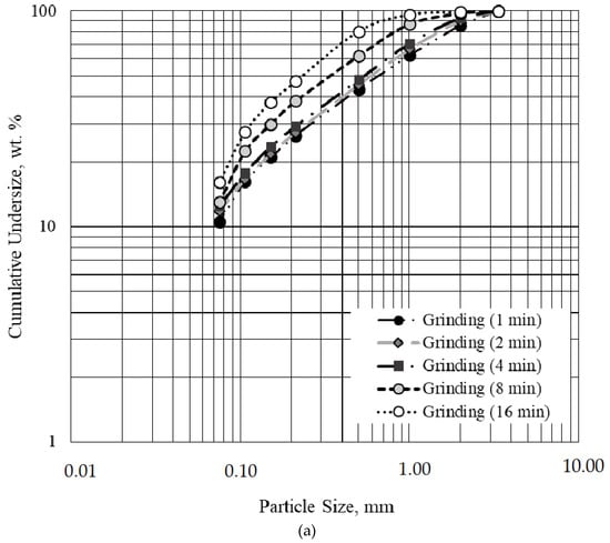 As can be seen in Figure 2a, the d80 size decreased to 0.5 mm in the lignite sample after 16 min of grinding, while it decreased to about 0.75 mm at the end of 8 min of grinding, and to about 1.1 mm at less than 8 min of grinding time. This causes an increase in the fraction of −0.212 + 0.075 mm as the target size and, at the same time, an increase of material in the fine fractions.