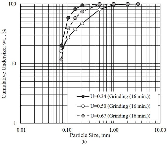 (a) Cumulative undersize values of lignite sample obtained from different grinding times (under constant U value as 0.5). (b) Cumulative undersize values of lignite sample obtained under different “U” values (under constant grinding time (16 min).