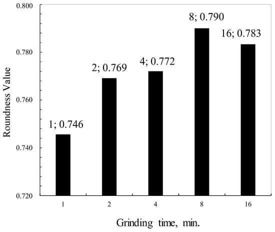 where A is the area of the particle and P is the perimeter. As roundness increases, the high-precision roundness value approaches one. The reason for using high-precision roundness values can be explained by the variation in particle shape based on very minor differences in their roundness values. In other words, as cited in [6,24], when the particle roundness values were in the range of 0.5–0.65, the particle shape was defined as “very angular”, but when they reached 0.65–0.70, the shape was then defined as “angular”. Accordingly, to present the morphology of the particles, high-precision measurements are essential for gathering the relationship between different production conditions. It can be clearly understood that even very small differences would result in different shapes. The accuracy of the method for making measurements of quartz was presented in our previous studies, which were used as reference point [21]. Additionally, these characteristics are very important in future processes like flotation due to the interaction degree of particles and bubbles, which in turn affects the flotation recovery values.