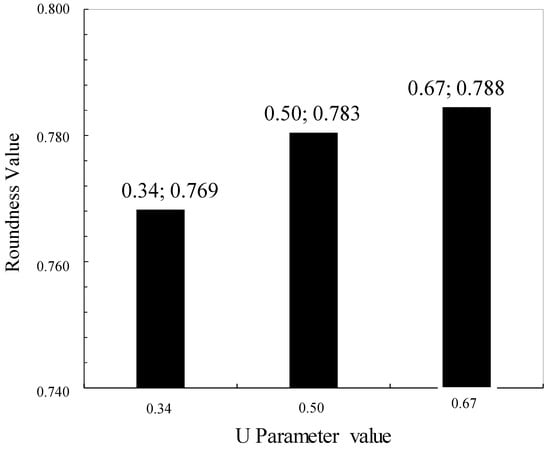 The roundness values obtained depending on the grinding time of the sample are shown in Figure 3, and the roundness values obtained depending on the U parameter are shown in Figure 4. As can be seen from the values shown in the figures, the relative decreases in the particle size of the material due to the increase in grinding time, and the morphological structure of the material, which was originally amorphous, led to a more rounded material. Therefore, it has been shown that the increase in fine size amount of the material affects the roundness of the material increasingly.