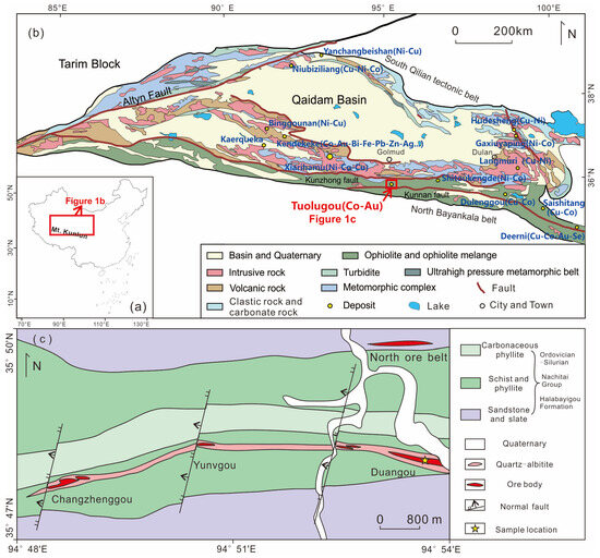 Figure 1. Geological background of the Tuolugou deposit. (a) Location and (b) regional geological setting of East Kunlun–Northern Qaidam region; (c) detailed geological map of the Tuolugou deposit (modified after [16]).