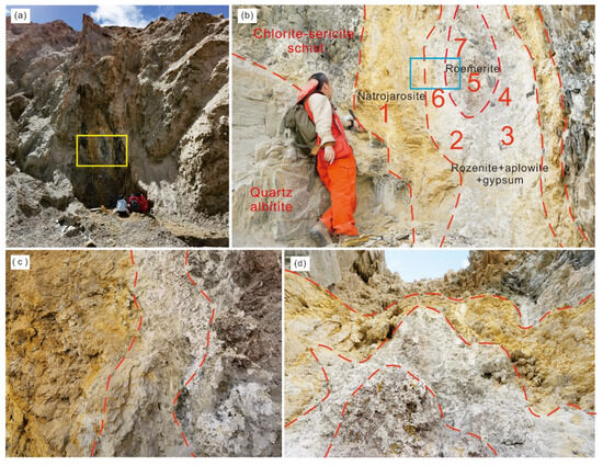 Figure 2. Outcrop of the hydrous sulfate zoning from the Duangou ore section, Tuolugou deposit. (a) Location of Figure 2b; (bd) zoning of the oxidation zone. Numbers in Figure 2b indicate the sampling locations of Sample 3-1 to Sample 3-7.
