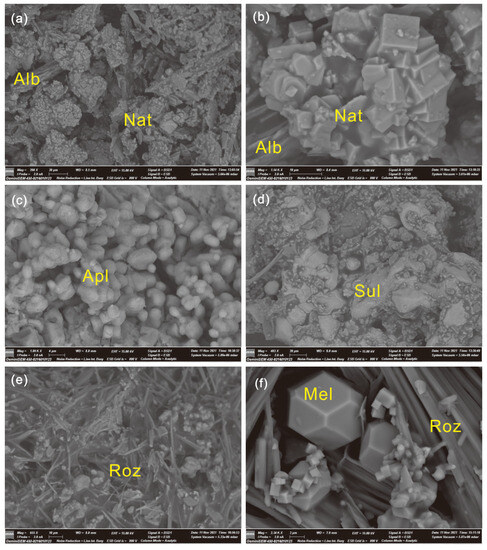 Figure 4. Typical SEM microphotographs of the samples from the oxidation zone of Duangou ore section, Tuolugou deposit. (a,b) Natrojarosite and albite; (c) aplowite; (d) native sulfur; (e) rozenite; (f) melanterite and rozenite. Alb—albite; Nat—natrojarosite; Apl—aplowite; Sul—native sulfur; Roz—rozenite; Roe—roemerite; Py—pyrite; Mel—melanterite.
