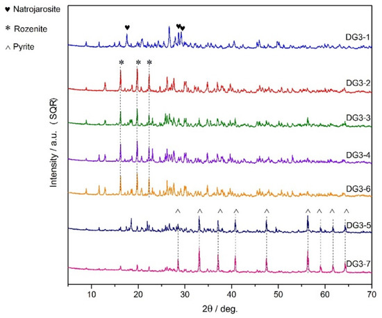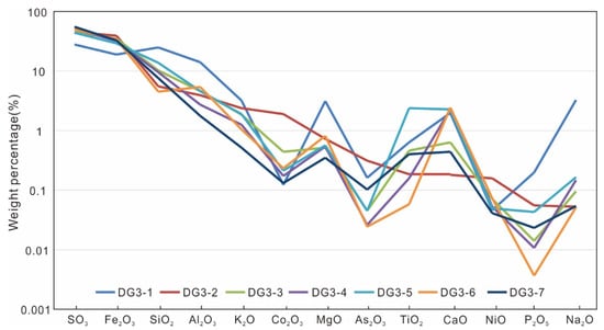 Micrometer-scale mineral particles are recognized under SEM-EDS, as indicated in Figure 4. Albite, natrojarosite, aplowite, native sulfur, rozenite, roemerite, pyrite, and melanterite are recognized as crystals of euhedral micron grade. Powder XRD results of the samples are shown in Figure 5. Sample DG3-1 was characterized by natrojarosite, DG3-2, DG3-3, DG3-4 and DG3-6 by rozenite. Pyrite was the diagnostic mineral phase in samples DG3-5 and DG3-7. Major elements identified by XRF are shown in Figure 6. SO3 (with an average of 45.7 wt.%), Fe2O3 (with an average of 31.8 wt.%), SiO2 (with an average of 11.0 wt.%), Al2O3 (with an average of 5.4 wt.%), K2O (with an average of 1.7 wt.%), and CaO (with an average of 1.5 wt.%) are the oxides that averaged more than 1 wt.% of the seven samples (Table 2). Following these are Co2O3, MgO, As2O3, TiO2, NiO, P2O5, and Na2O, of which the average values were less than 1 wt.%. The content of Co2O3 ranged between 0.12 and 1.09 wt.%, with an average of 0.46 wt.%. The cell parameters of roemerite and melanterite are shown in the cif files as Supplementary Materials.
