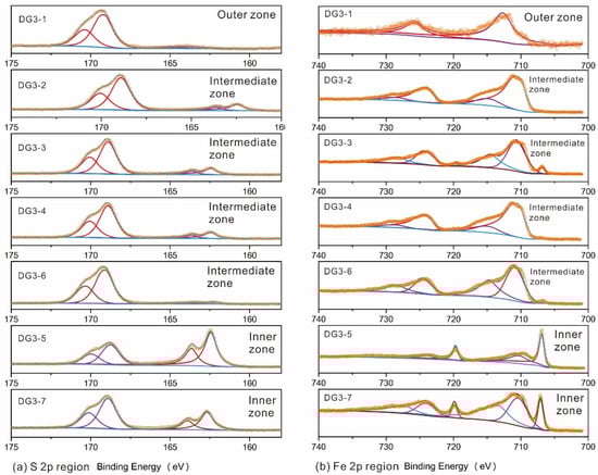 Figure 7. X-ray photoelectron spectroscopy spectra (XPS) of the samples from the oxidation zone of Duangou ore section, Tuolugou deposit, in the S2p and Fe2p regions. The purple, red, and blue lines are the fitting curves of the elements with different valence states. The orange circles are the measured XPS data.