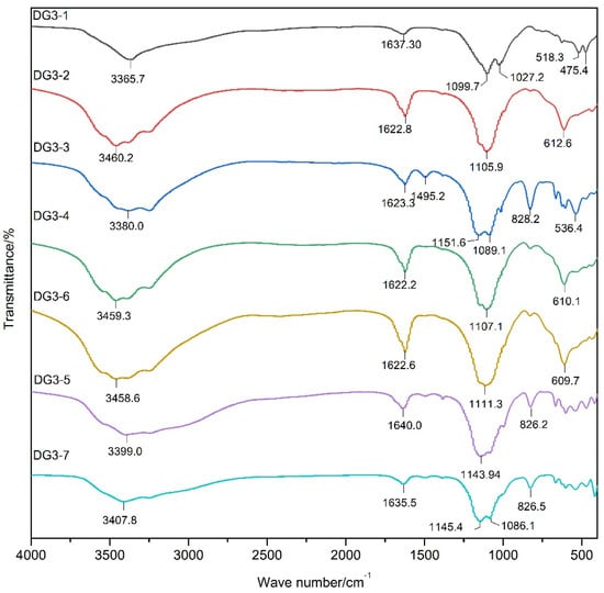 The XPS results are shown in Figure 7 and Table 3. For the outer zone (Sample DG3-1), sulfur of the +4 valence was predominant. For the intermediate zone, minor S2+ could be detected, whereas S2+ was abundant in the inner zone. The Fe XPS results show various valences on the surfaces of the samples from the oxidation zone of the Tuolugou deposit. Sulfide and sulfate occupied different proportions in different zones. For the outer zone, Fe3+ was predominant, and in the intermediate zone, Fe2+ and Fe3+ in oxidation products comprised the majority of the samples. Fe2+ in sulfide represented a nonnegligible part of the inner zone. The FT-IR results are presented in Figure 8 and Table 4. All of the samples showed broad bands of water molecules and valleys of about 1620–1640 cm−1 of water. The SO42− also showed shoulders of about 3350–3400 cm−1 and 1000–1150 cm−1. Three zones were recognized in the oxidation zone of the Duangou ore section, Tuolugou deposit, as shown in Figure 2, and the details are discussed in Section 6.2.