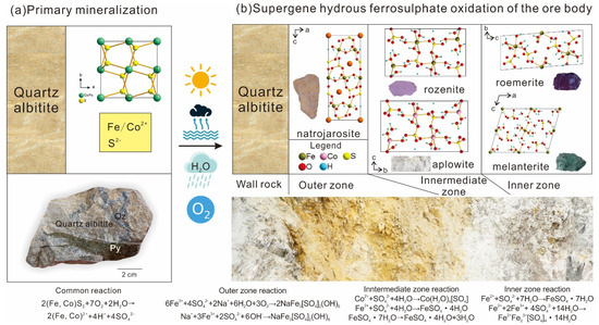 Pyrite is the most widespread cobalt-bearing mineral in the Tuolugou deposit. The pyrite oxidation process is a significant part of the global sulfur cycle and has important environmental implications in the formation of acid mine wastewater and the oxidation and acidification of sediments [19,20,21]. The widespread presence of hydrous sulfate minerals is not only strong evidence for the existence of an acidic aqueous environment, but also provides clues for understanding the environment during the evolution of surface substances [22,23].