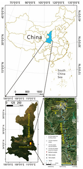 China’s demand for mineral resources is growing, and the contradiction between supply and demand is worsening. Unreasonable and unscientific development of mining resources has also introduced a series of environmental degradation problems to the local water and soil environment, such as vegetation damage, soil loss, groundwater level decline, river and sediment pollution, and excessive PTEs in crops [1,2,3,4]. The problems of PTEs in river water and sediments have been focused on by many environmental studies because they involve the lives of coastal residents and concern crop irrigation and food safety [3]. Studies have shown that contamination with Cd, Zn, Mn, and Ni in river sediment was serious, and Cd and Cu were the main risk factors [4,5]. In addition, by analyzing the PTEs such as Cu, Zn and As in the smelting waste dump distributed in the alunite mining area near the Lujiang River, the degree of pollution of the Lujiang River watershed caused by human activities was evaluated. The study findings revealed that Cd and As were the primary pollutants identified [5]. Another research effort focused on analyzing the levels of PTEs in river and sediment samples collected from three different types of rivers within the Xiaoqinling area. Results indicated that four rivers in mining regions exceeded the national standard limit, with seven PTEs in the river surpassing the national water quality limit [6]. Hengshi River, located in South China and heavily impacted by polymetallic mining, was studied extensively. Researchers divided the water system of the Dabaoshan Mining Area into a kilometer grid, collected and analyzed 60 water samples, and examined the distribution characteristics of PTEs such as Cd, Co, Zn, and others in the mining area [7]. In investigating the impact of acid mine drainage from the Dabaoshan Polymetallic Mine in the mountainous region of northern Guangdong on Hengshi River, previous research analyzed the spatial distribution of concentrations of PTEs, namely Mn, Cu, Zn, As, Cd, and Pb, and found that the discharged wastewater from the Dabaoshan mining area was the primary cause of severe river pollution [8]. Additionally, other researchers examined the migration and transformation of toxic elements at the source of the Dabaoshan mining area, focusing on Cd, Zn, Cr and Ni in samples such as soil, tailings, and plants [8]. The analysis showed that the main pollution sources in this area were pit soil, tailings, and waste rock dumps, and it was necessary to focus on the exposure path of inhaled soil particles [9]. Predecessors have extensively analyzed the mining area environment, surrounding rivers, and sediment samples distributed nationwide, which has provided strong data support for preventing and controlling river pollution in various regions [10]. However, this study found that the current research idea of PTEs in the rivers in the mining area is only limited to the use of sediment to speculate on the pollution of river water [7,8,9]. We can still help broaden the comprehensive pollution analysis of the whole area by only testing the river and supplementing the analysis of PTEs in surrounding rock and water sediment.