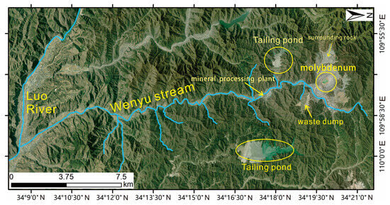 The Wenyu stream originates from the southeastern slope of the Xiaoqinling Mountains, located approximately 5 km northwest of Jinduicheng in southeastern Shaanxi Province, China [20]. The Jinduicheng molybdenum deposit is situated in the southern margin of the North China Platform and the Qinling Orogenic Belt. This deposit belongs to a type of molybdenum deposit that is rich in veins in China. The crystalline basement in the area is composed of the Archean Taihua Group metamorphic rocks, mainly consisting of amphibolite-migmatite gneiss, mixed alteration biotite plagioclase schist, and mixed alteration Huanggang granite [20]. The Wenyu stream is composed of multiple streams, with a total length of approximately 33 km. The mining area is about 26 km away from the mainstem of the Luo River in Shangluo (Figure 1). The upstream valley of the Wenyu stream is narrow, with fast-flowing water and only a small amount of sand and gravel deposition at the riverbed. Some parts of the watershed have exposed bedrock, and there is less arable land. The middle and lower reaches of the river have a flat terrain, wider riverbeds, and slower water flow due to the inflow of tributaries from both sides. As a result, the riverbed accumulates more sand, gravel, and sediment. Large-scale open-pit molybdenum mines and ore processing plants are distributed near the upper reaches of the Wenyu stream watershed. Facilities related to mining, tailings ponds, and ore processing plants are concentrated on both sides of the watershed, with a length of approximately 7 km from north to south. The Wenyu stream region has a warm temperate climate with a moist monsoon climate on the southern edge. The mining area has an annual average temperature of 11.5 °C and an average annual rainfall of 770 mm, with most of the rainfall occurring from July to October. The prevailing winds are northwest winds and east winds, with an average annual wind speed of 1.5 m/s. The main metallic minerals in the area are molybdenite and pyrite, followed by magnetite and chalcopyrite [20]. The ore structure is mainly composed of skarn and porphyry structures [21]. Figure 2 shows a schematic analysis of the molybdenum mining area. The surrounding rock samples are mainly mineralized with pyrite and molybdenite. Pyrite is widely developed in the ore, with a content generally ranging from 1% to 5%. The main economically valuable mineral is molybdenite, with a content generally ranging from 0.06% to 0.40% [20,21].