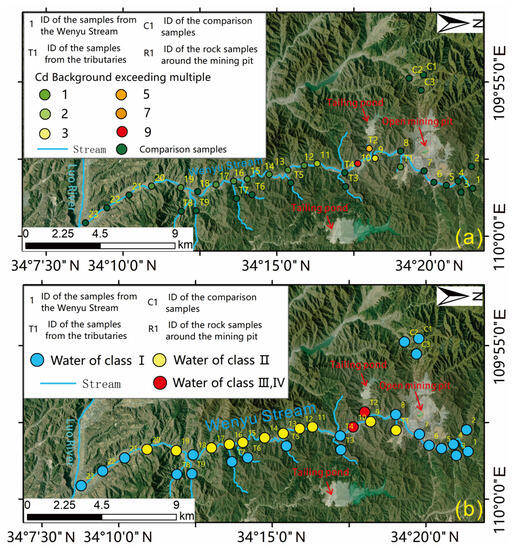 The evaluation maps of the Cd background exceeding multiple (a) and the water of class (b) from surface water in the Wenyu stream.