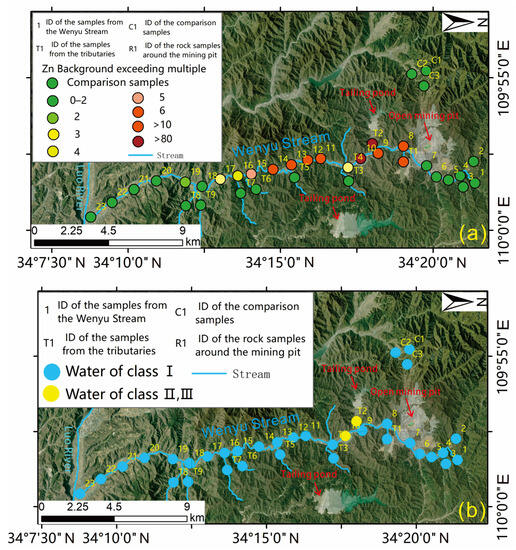 The evaluation maps of the Zn background exceeding multiple (a) and the water of class (b) from surface water in the Wenyu stream.