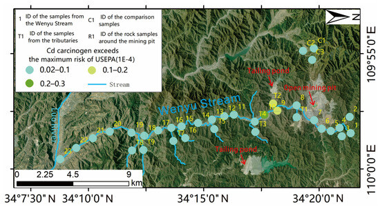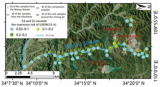 The comprehensive risk assessment of water environmental health in the Wenyu stream is a collection of risks caused by chemical carcinogens and non-carcinogens [27]; by analyzing the comprehensive health risks caused by non-carcinogen Zn absorption through the skin and drinking water, as well as carcinogen Cd, we can reflect the impact of the development of this large molybdenum mine on the surrounding water environment and analyze the potential risks to human health, animals, and plants, as shown in Figure 7.