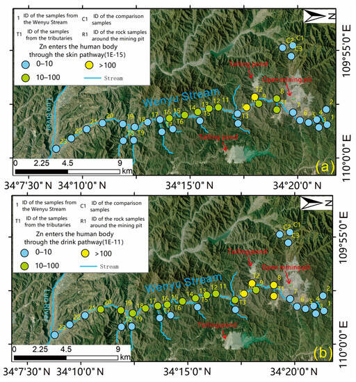 The evaluation maps of the results of Zn health risk assessment. (a) Zn enters the human body through the skin pathway (b) Zn enters the human body through the drink pathway.
