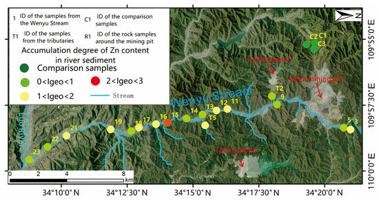 The accumulative degree of Zn in river sediment is shown in Figure 9. In the main Wenyu stream, point 15 was at the level of moderate to severe pollution; points 3, 11, 12, 16, 17, 19, and 21 were at the level of moderate pollution; only six points, 5, 13, 14, 19, 22 and 23, were at the level of no pollution to moderate pollution. In the tributary channel, T2 had no pollution–moderate pollution, and T5 had moderate pollution. The sediment samples from the Wenyu stream watershed in Shangnan County showed that the content of Zn in the sediment in this watershed was higher than that in the control area, indicating that mining activities have caused a certain degree of pollution to the Wenyu stream watershed. The above research results showed that the development of mineral resources is an important reason for the enrichment in heavy metals in the river sediments in the mining area, and it is of great significance to study the pollution degree of heavy metals in the sediments to reflect the pollution of river water.