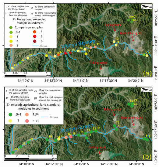 The evaluation maps of the excessive degree of Zn in sediment. (a) Zn background exceeding multiple in sediment; (b) Zn exceeds agricultural land standard multiples in sediment.