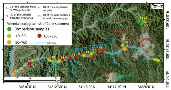Based on the Hakanson’s potential ecological risk index method, the potential ecological risk index for Cd was calculated at each sediment sampling point. Figure 12 illustrates that the potential ecological risk index for PTE Cd in 15 sediment samples from the main stream ranged from moderate risk to very high risk. This indicates that the sediment in the main stream poses a strong ecological risk as a whole. Referring to the classification principle in Table 3, we could find that samples with strong ecological risk, samples with strong ecological risk, and samples with moderate ecological risk accounted for 40.00%, 46.67%, and 13.33%, respectively. In the tributary stream, point T2 exhibited a strong potential risk, while point T5 had a very strong potential risk. Based on the analysis of these results, the pollution of Cd in the sediment of the Wenyu stream watershed poses a severe threat to the ecological security of the watershed. This can be attributed to two possible reasons. On one hand, the Cd content in river sediment is notably higher than the average value of the contrast area, indicating a significant cumulative effect of elements resulting from mining activities. On the other hand, this can be attributed to the high toxicity response coefficient of Cd, which is unique to this element. It is important to note that, in this study, the average value of sediment in the unaffected area is utilized as the background reference value when selecting the environmental background value . By default, this selection ignores the impact of the primary geological background of the study area on the Cd content in the sediment and only considers the impact of mining activities, which is consistent with the overall research idea of this paper. Using the study area’s heavy metal background value as a reference can provide a better reflection of the pollution level caused by mining activities on the environment.
