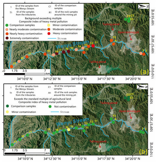 The evaluation maps of comprehensive index of heavy metal pollution. (a) Background exceeding multiple composite index of heavy metal pollution; (b) Exceeds the standard multiple of agricultural land composite index of heavy metal pollution.