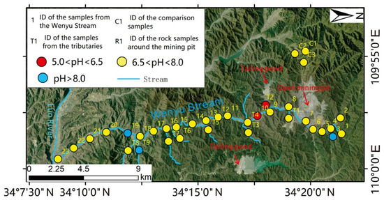 It can be seen in Figure 15 that the abnormal pH values in the Wenyu stream watershed were found at point T2 and point 10, and the pH values of both were between 5.0 and 6.5, which is acidic water quality. A tailings pond about 0.5 km to the west of the river basin was considered to be one of the possible reasons for the abnormal pH of the river, as it featured acidic mine-polluted wastewater with excessive heavy metal content discharged to the main stream upstream of point T2 [34]. According to previous research and analysis, the main formation of acid drainage in mines occurs as follows: first, in the mineral processing process of mining activities, different grades of ores need to be purified to a high grade, which can be achieved by adding a large number of acid reagents. The wastewater discharged after the completion of ore processing activities is the main acidic water in mining areas; second, sulfide minerals stacked in the open air in the mine waste dump and tailings pond can easily oxidize and form sulfate ions and heavy metal ions after contacting with the air. In the case of precipitation or transportation treatment, they are enriched in the mining area through leaching and form acidic wastewater; third, groundwater seepage and tailings pond waste leakage are inevitable in mining activities [35], and there may be rocks and soils containing sulfur or heavy metal elements in the underground strata, which may dissolve and form acidic mine water in long-term mining activities. In this study, developing this large molybdenum mine may produce acid mine drainage in these three ways. Combined with the previous research results and the analysis of the local original geological background, the acid wastewater produced by mining activities in the mining area and its unqualified discharge was another important reason for the heavy metal Cd and Zn pollution in the Wenyu stream. The main solutions for acid wastewater are to block the source of pollution, control the migration of wastewater, and actively (passively) treat the end of water inflow [36]. When studying the pollution of coal mines in Guizhou, predecessors proposed that filling the mined-out area with carbonate rocks can be used in the mining area to avoid the discharge of acid water in the mining area [37]. From the biological point of view, other researchers have suggested that the domesticated microbial population can be used to treat acidic wastewater [38].