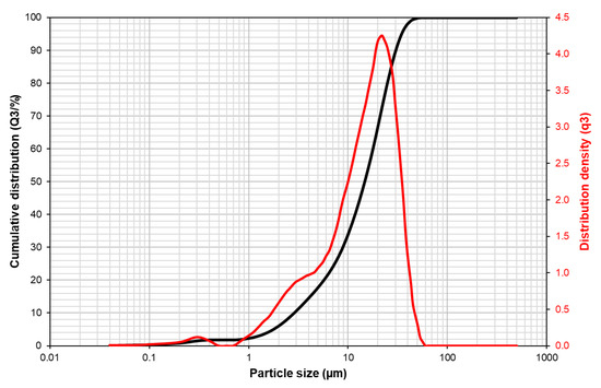 Figure 2 shows the particle size distribution of representative quartz samples. As seen, 100% of the particles were below 56 μm and 80% (d80) under 24.9 μm. The ultrafine fraction (particles finer than 10 μm) was equal to 34%. The quartz sample’s density was 2.63 g/cm3, which is in close agreement with pure quartz samples given in the literature (i.e., 2.65 g/cm3) [27]. The specific surface area was 0.891 m²/g.
