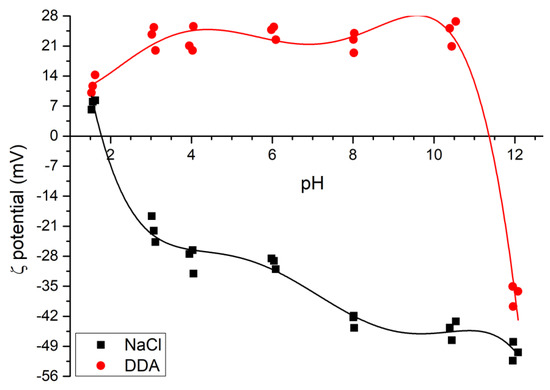 Figure 3. Zeta potential measurements for the quartz particles in the absence (NaCl −10−3 mol·L−1) and presence of DDA (at 1 × 10−3 mol·L−1) as a function of the solution pH.