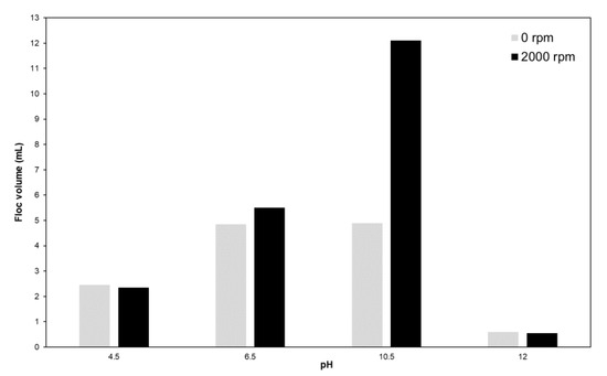 Figure 7. Sedimented quartz flocs volume as a function of the solution pH, in the presence of DDA (at 1 × 10−3 mol·L−1), both with and without stirring at 2000 rpm.