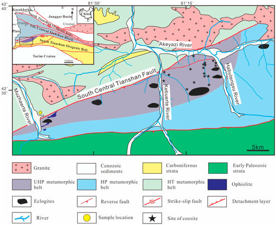 - Zhang, L.; Du, J.; Lü, Z.; Yang, X.; Gou, L.; Xia, B.; Chen, Z.; Wei, C.; Song, S. A huge oceanic-type UHP metamorphic belt in southwestern Tianshan, China: Peak metamorphic age and P-T path. Chin. Sci. Bull. 2013, 58, 4378–4383. [Google Scholar] [CrossRef]