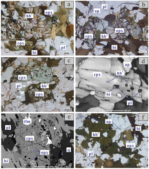Photomicrographs of the mafic granulites in the Muzhaerte area. (a) Equigranular granoblastic texture of granulites (taken in plane polarized light). (b) Anhedral crystal forms of the two pyroxenes (taken in plane polarized light). (c) Two pyroxenes have retrogressive amphibole reaction rims (taken in plane polarized light). (d) The clinopyroxene occurs as rounded porphyroblasts, containing biotite, hornblende and plagioclase inclusions (backscatter photo by JCM-6000PLUS). (e) Clinopyroxene develops oriented orthopyroxene rods along the c-axis (backscatter photo by JCM-6000PLUS). (f) The hornblende (hb2) formed at the rim of pyroxene or in the form of huge grains that contain some anhydrous inclusions (taken in plane polarized light). Mineral code: cpx—clinopyroxene; opx—orthopyroxene; hb—hornblende; bi—biotite; pl—plagioclase; q—quartz; ap—apatite; ilm—ilmenite.