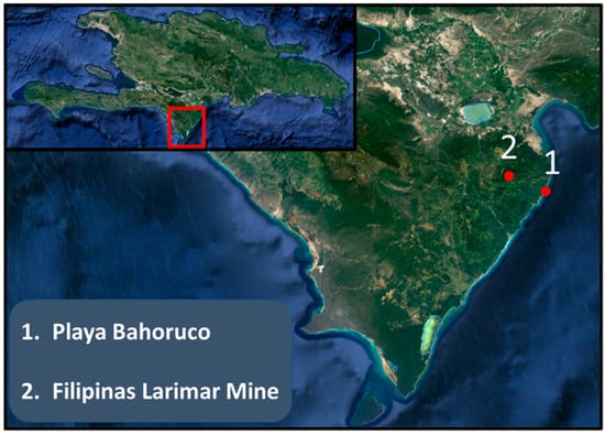 In 1974, Miguel Méndez, a jewelry craftsman, met a German woman at his wife’s beauty salon in the Dominican Republic, and she showed him a beautiful unknown blue–green stone. Méndez immediately thought it was turquoise, but the customer told him it was another mineral from the Dominican Republic. The first location where Larimar was discovered by Miguel Méndez and Norman Rilling, a US Peace Corps geologist, was the coast of Playa Bahoruco, Barahona (Figure 1) [1]. Now, the main mining area of this gemstone is in the Filipinas Larimar Mine.