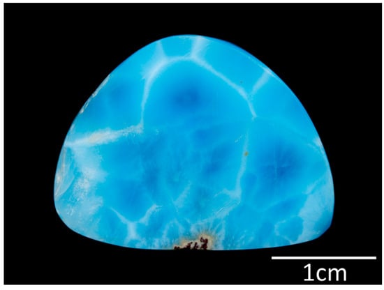 In recent years, the blue–green gemstone “Larimar,” with a sea-wave pattern, has appeared in the gemstone market. It has a higher commercial value because of its charming sky-blue color (Figure 3). The most famous deposits of pectolite ores are distributed in Italy, Germany, and Russia in Europe; New Jersey, Nevada, Arkansas, and California in North America; the Dominican Republic, Brazil, and Argentina in Latin America; Japan and India in Asia; Tanzania and Madagascar in Africa; Australia and New Zealand in Oceania, etc. However, the unique blue–green pectolite with a sea-wave pattern and fibrous radial texture occurs only in the Dominican Republic [1,2,4,5,6].