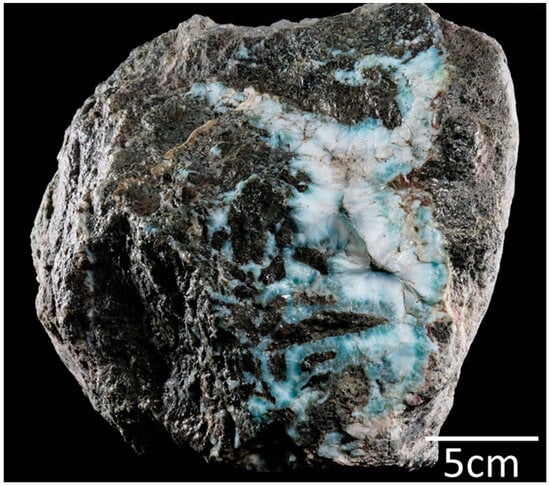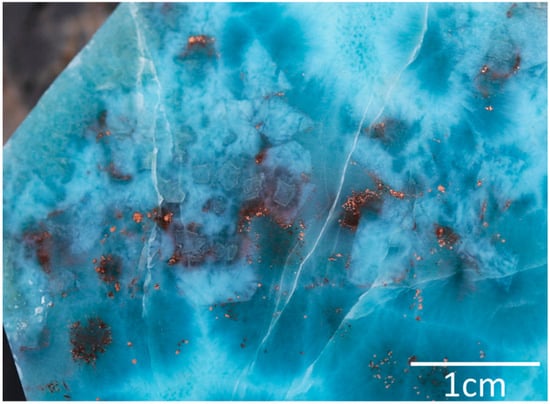 Pectolite is a variety of a single-chain mineral of the pyroxenoid group, with a Mohs hardness of approximately 4.5–5. Pectolite (NaCa2Si3O8(OH)) is generally found in geological contexts very similar to those of zeolites, i.e., in the cavities of hydrothermally altered mafic igneous rocks, including basalts, particularly in those with alkaline affinity [7]. Generally, pectolite can be colorless, white, gray, yellow, etc., and its common crystal habits are platy, prismatic, needle, and radial. A notable, orange-colored pectolite is known as serandite (Na(Mn2+,Ca)2Si3O8(OH)), and it is formed by the substitution of the transition metal ion Mn2+ in the Ca2+ position [8,9]. Due to the presence of native copper particles within the Larimar and the wall rock (Figure 4), Cu2+ ion is considered to be the cause of coloration of the blue–green pectolite, as is the case with other blue–green minerals, such as azurite, shattuckite, turquoise, chrysocolla, etc. In addition, the color shade of the sea-wave pattern is assumed to be dependent on the copper ion concentration [2]. However, in addition to copper, significant concentrations of vanadium have also been detected in Larimar and its wall rock [10,11]. Therefore, the cause of Larimar coloration has yet to be determined. Larimar is only found in the south of the Dominican Republic, in Barahona Province (Figure 1). Pectolite and other minerals fill the cavities or veins in basalt, which can be classified as Ti-depleted tholeites and Ti-rich alkali basalt [12,13]. Basaltic lava flows and pyroclastic flows overlay the limestone formations, or form dikes and disks in the limestone. There were two periods of high magmatic activity in the geologic history of the area: the first occurred at 92–74 Ma, while the second period, which was dominated by the formation of diabase dykes, occurred at approximately 53 Ma. A detailed geological profile of the local area and the mineral composition of the rocks were mentioned by Escuder-Viruete et al. (2016) [13].