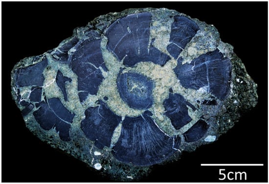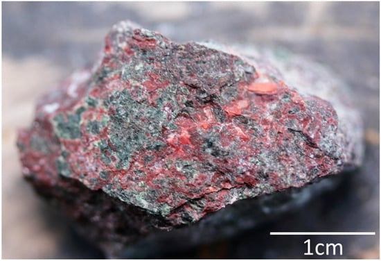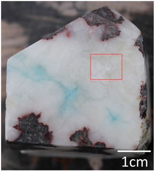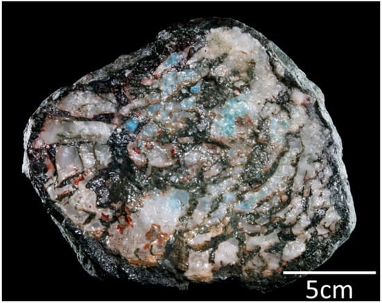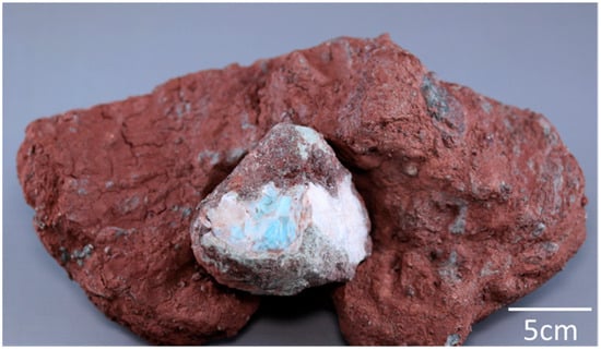 The Larimar samples collected for this study occurred as fragments wrapped in laterite (Figure 5), basalt fissure filling (Figure 6), and also as calcite and pectolite that filled plant fossils (Figure 7 and Figure 8). Most of the laterite contains muddy blocks and pyroclastic conglomerates of basaltic and ultramafic rocks, and these conglomerates mainly consist of highly weathered or metasomatic rocks, like hematized rocks (Figure 9) or serpentinite. The hematization is mostly the result of the oxidation of pyroxene and other mafic minerals in the wall rocks [3] caused by oxidative fluids. According to some research, the sea-wave pattern was believed to be related to the plant structures, because the pectolite and calcite filled in the plant fossils (Figure 8) [10]. Studies related to the carbonization of plant fossils associated with Larimar have been published [14]. No one knows why unique blue–green pectolite occurs in this locality or the chemical and physical mechanisms for its blue–green color and the special sea-wave pattern in the spherulitic structure of Larimar. In this study, it is hoped that these thought-provoking questions can be answered.