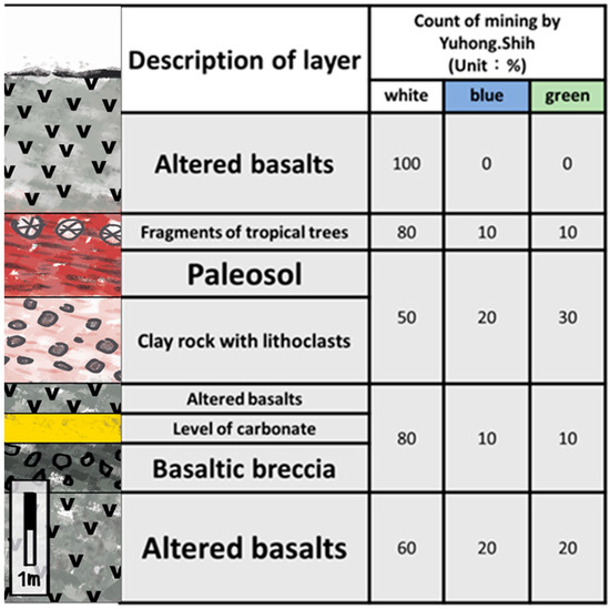 The Filipinas mine, where Larimar is currently mined, mainly utilizes the tunnel mining method to extract the samples. Figure 10 shows a rough estimate of the proportions of pectolite mined from the different layers of the mine. The pores in the weathered basalt on the surface are mainly filled with white pectolite. As the depth increases, blue–green pectolites gradually appear in a layer where carbonaceous plants (Figure 7 and Figure 8) are also present between altered basalts and paleosol. The abundance of blue and green pectolites increases in the highly weathered red soil and debris layers, which contain more hematite clasts. After passing through the limestone formation beneath the paleosol layer, a basaltic breccia layer appears, and the amount of bluish pectolite decreases again.